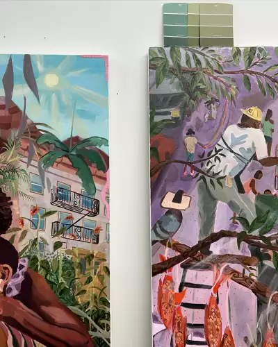 My works are about home, community, and belonging. I reimagine and hybridize landscapes that center boundless Caribbean existences—taking up space, forging new realities, and experiencing the buoyancy of daily life post-migration. Pulling from elements of my hometown, Brooklyn, and my ancestral homeland, Haiti, I ultimately question: How does the diaspora continue to place their trust in reimagining new realities of being? How does one reinvent home away from home?