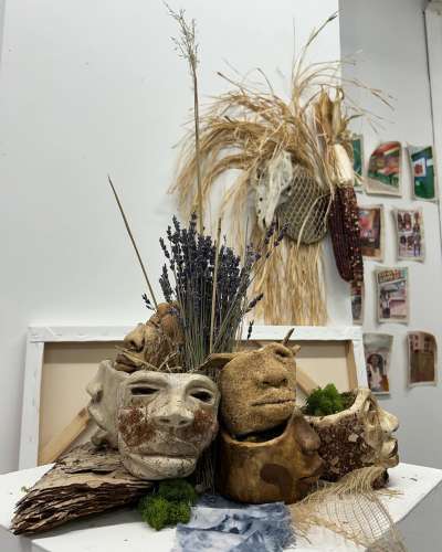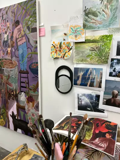 I am inspired by the concept of the lakou, which in Haitian Kreyòl translates to "communal yard" or "small village." Lakous are usually developed and maintained through multiple generations who live, engage, and work cooperatively. They are catalysts for resistance and have sparked many revolutions that still inform the diaspora’s relationship to their bodies, communities, and the land. They hold space for rage, liberation, celebration, ancestral connection, and most importantly, agricultural autonomy. I utilize this framework to examine how the diaspora leans on ancestral knowledge and ways of being while forging new pathways of cultural identity within the landscape. In thinking about Edwidge Danticat’s The Haiti That Dreams, I feel compelled to create worlds that embody the spirit of resistance and hope despite a history of turmoil.