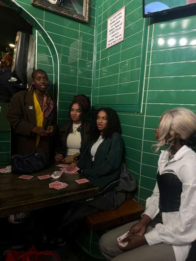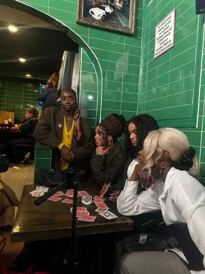 A group of Haitian girlfriends sit together in a pizza parlor—mid-game, mid-moment. Their expressions carry focus, amusement, quiet confidence. The green tiles and red booths frame the scene, but the story lives in their body language: the unspoken familiarity, the ease of shared rituals, the small acts that build camaraderie.